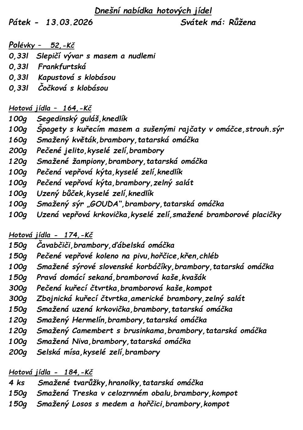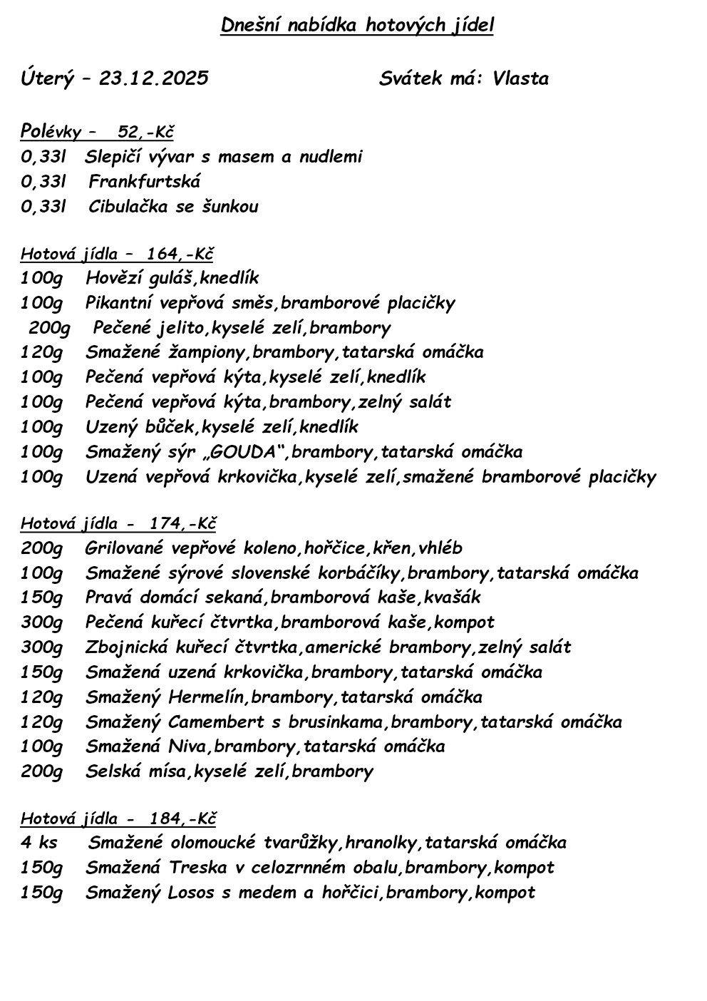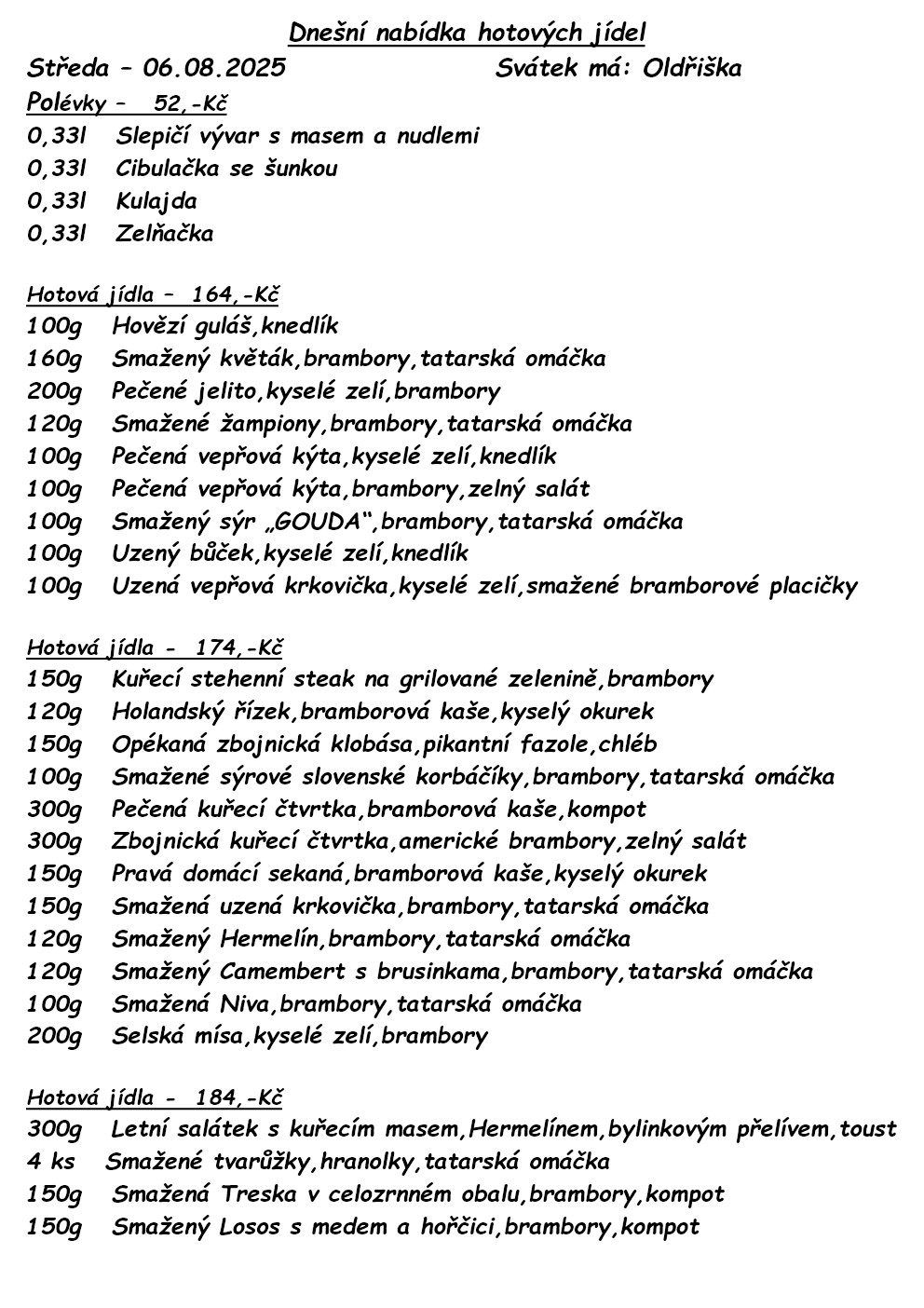 V naší nabídce tak naleznete hotovky, ryby, steaky, studenou kuchyni, těstoviny, saláty i vegetariánská jídla.