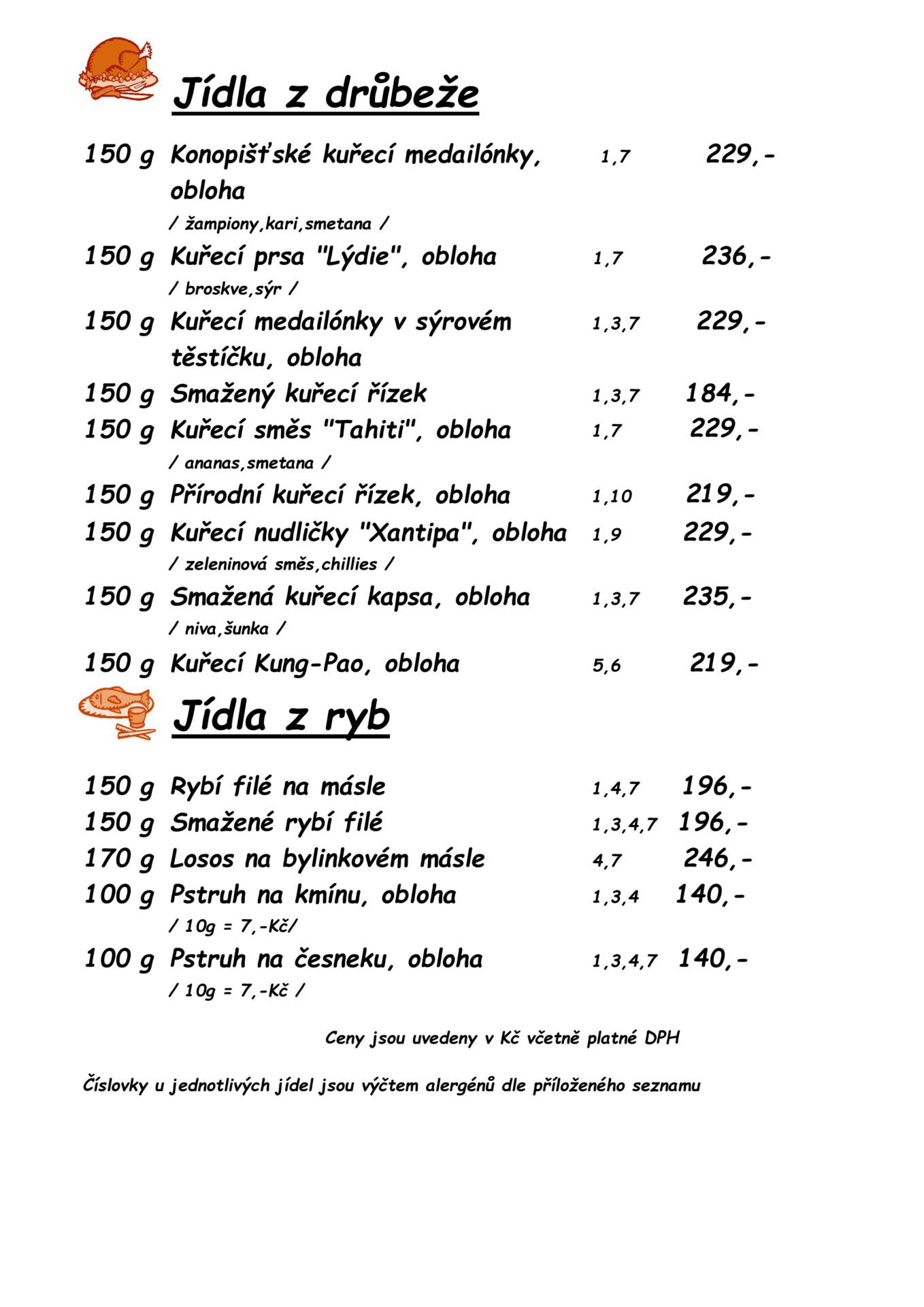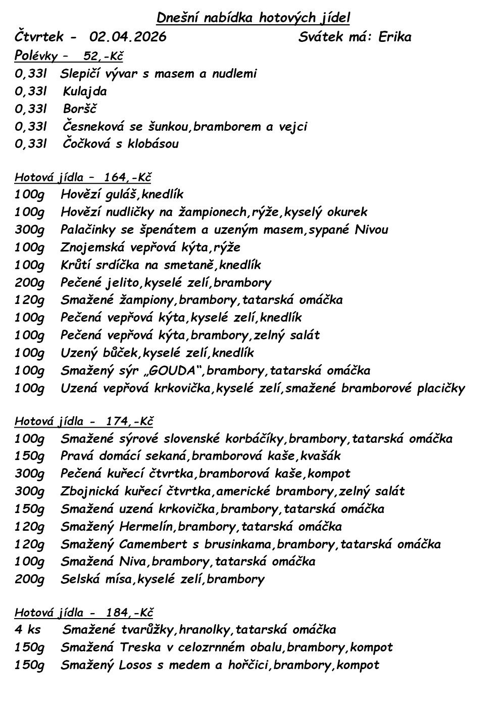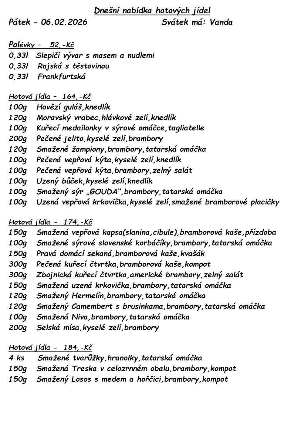 V naší nabídce tak naleznete hotovky, ryby, steaky, studenou kuchyni, těstoviny, saláty i vegetariánská jídla.