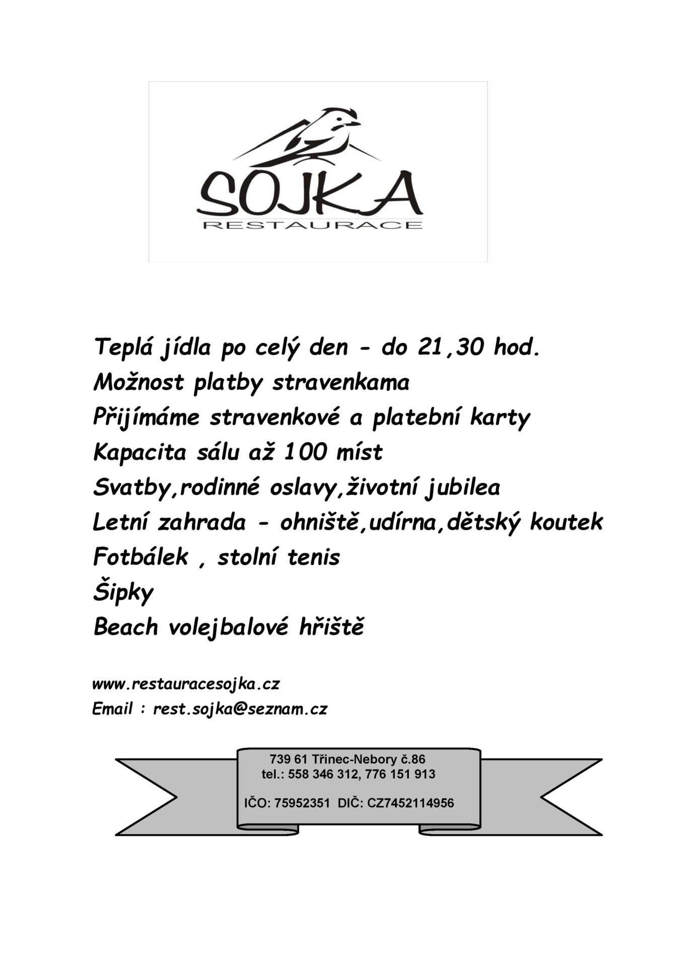 Restaurace Sojka se nachází u hlavní cesty E75. Nabízíme restaurační služby – vaříme pravá česká hotová jídla, denní menu a minutkovou kuchyni. Sídlíme v Třinci-Neborech, okres Frýdek-Místek a srdečně Vás zveme k nám do restaurace.